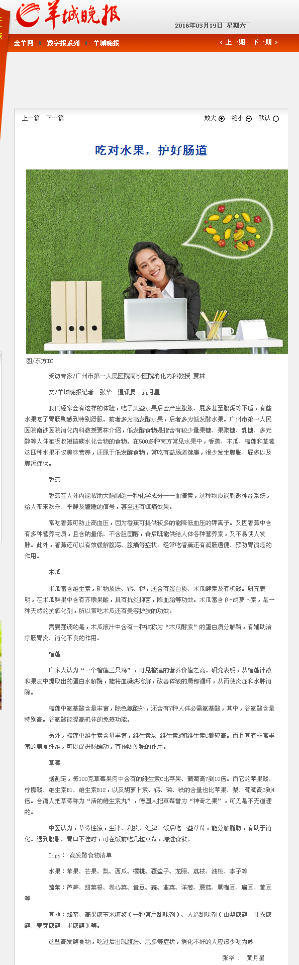 《羊城晚报》:吃对水果,护好肠胃 2016年3月19日B8版