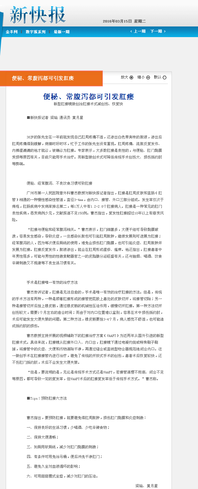 《新快报》:便秘、常腹泻都可引发肛瘘 2015年3月15日B05版