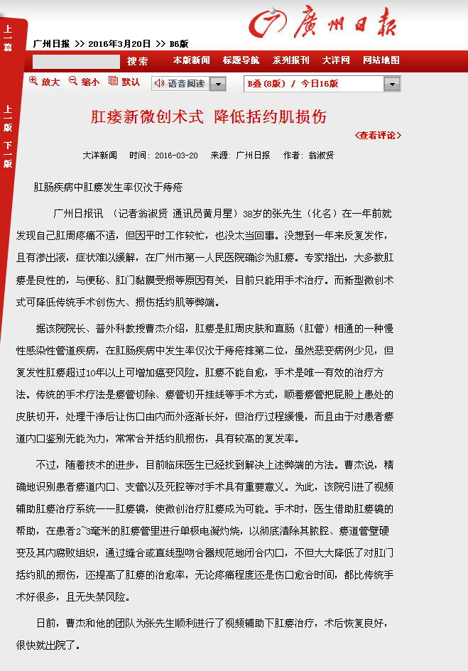 《广州日报》:肛瘘新微创术式 降低括约肌损伤 2016年3月20日B6版