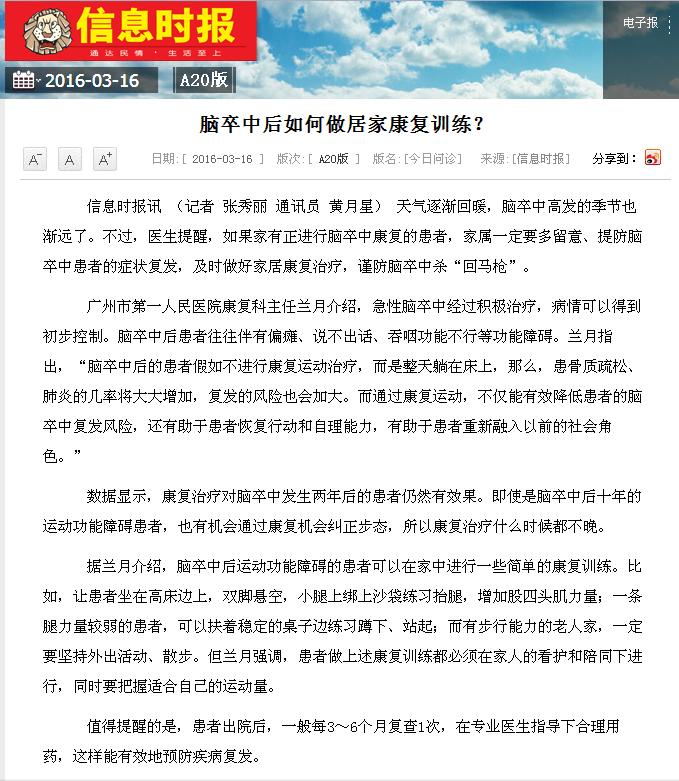 《信息时报》:脑卒中后如何做居家康复训练? 2016年3月16日A20版