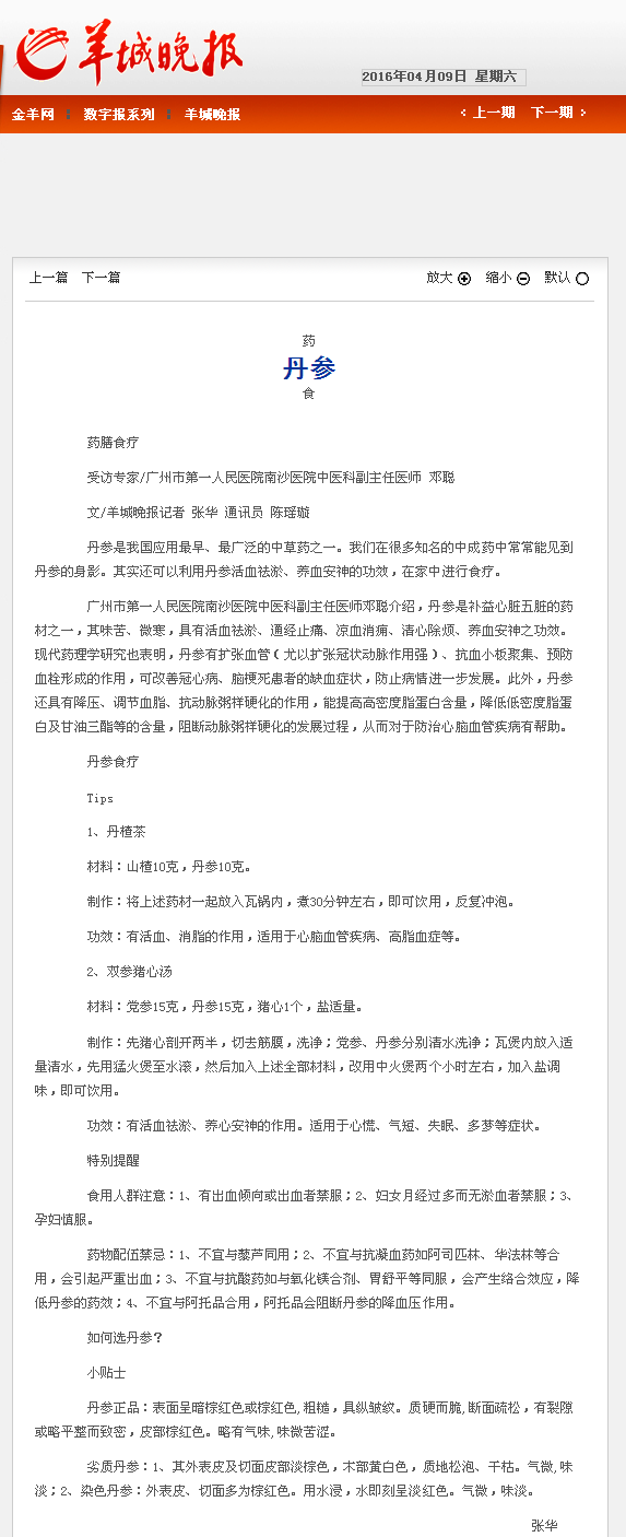 《羊城晚报》:药食-丹参 2016年4月9日B08版