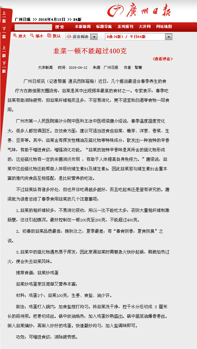 《广州日报》:韭菜一顿不能超过400克 2016年4月12日B4版
