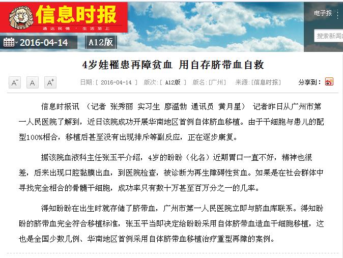 《信息时报》:4岁娃罹患再障贫血 用自存脐带血自救 2016年4月14日A12版