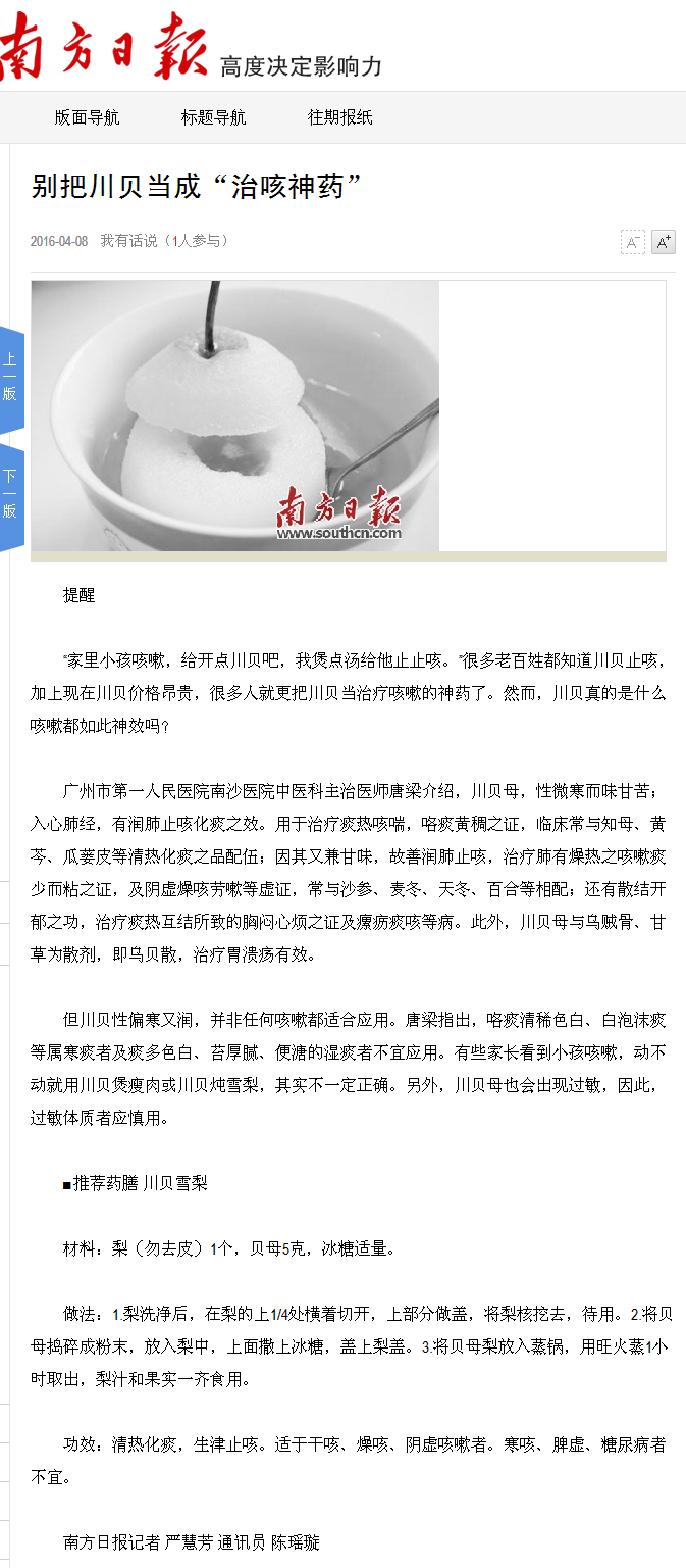 《南方日报》:别把川贝当成“治咳神药” 2016年4月8日A21版