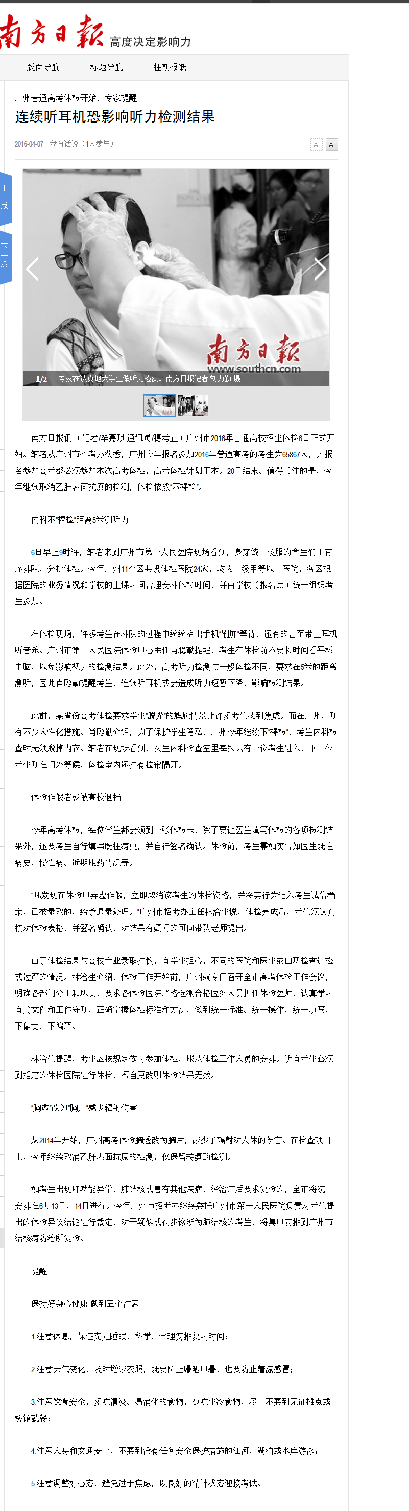 《南方日报》:连续听耳机恐影响听力监测结果 2016年4月7日A06版