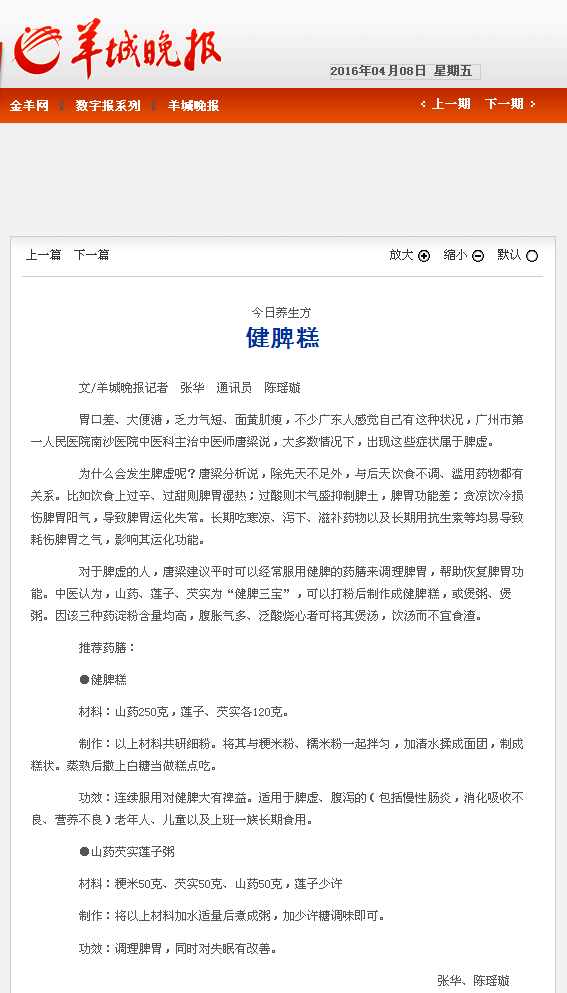 《羊城晚报》:今日养生方—健脾糕 2016年4月8日A18版