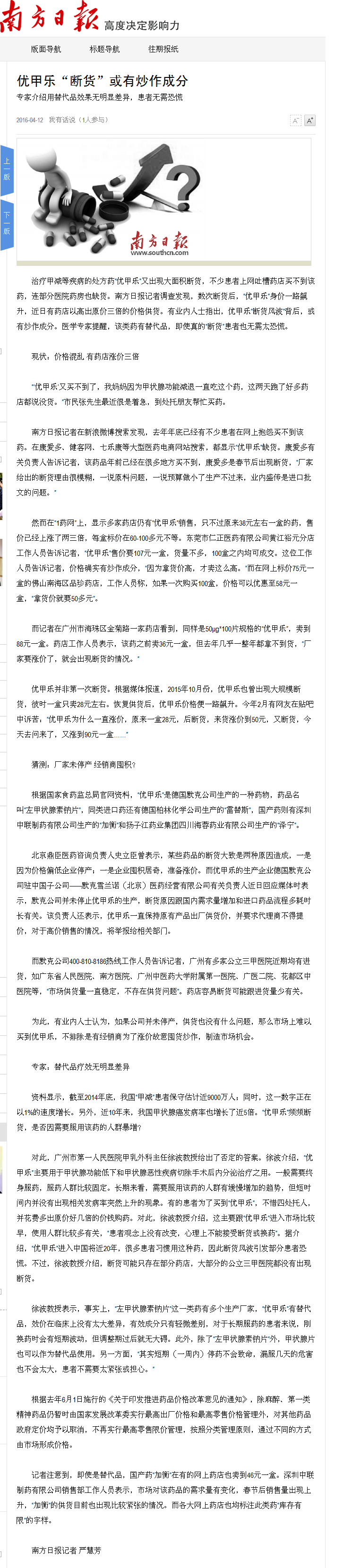 《南方日报》:优甲乐“断货”或有炒作成分 2016年4月12日B02版