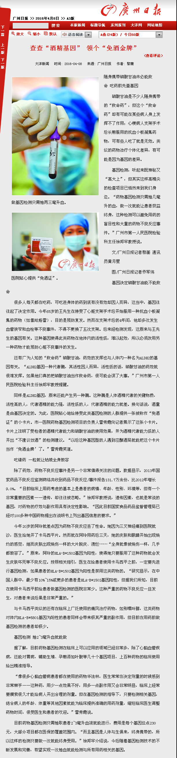 《广州日报》:查查“酒精基因” 领个“免酒金牌” 2016年4月8日A3版