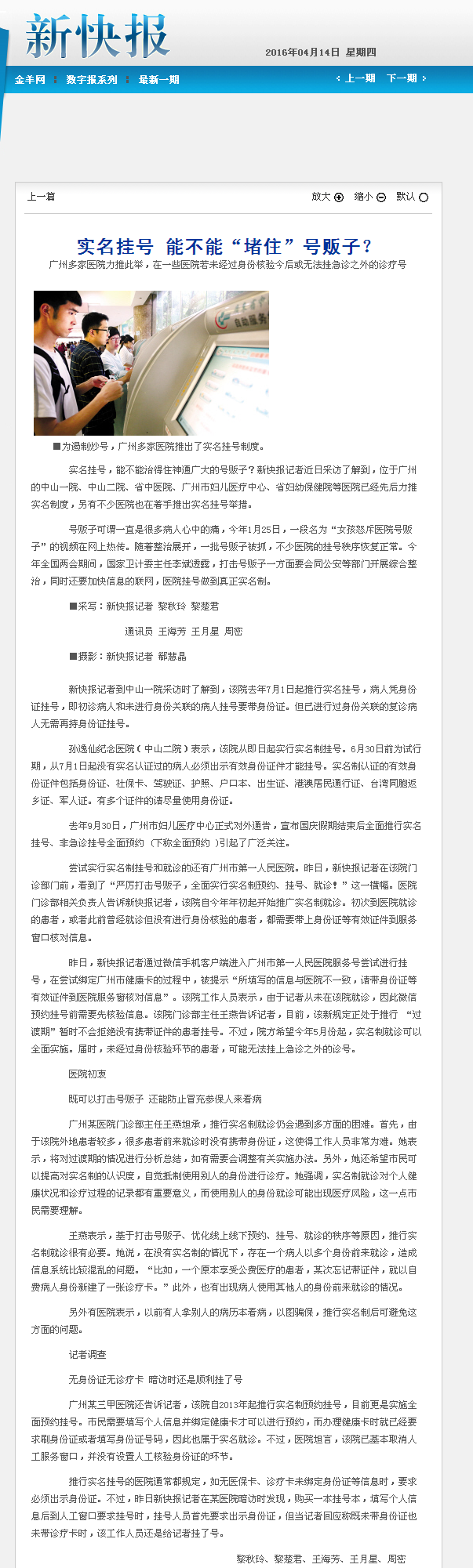 新快报:实名挂号,能不能堵住“号贩子”?2016年4月14日A14版