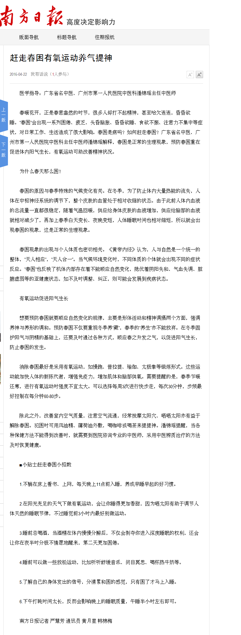 《南方日报》:赶走春困有氧运动养气提神 2016年4月22日A25版