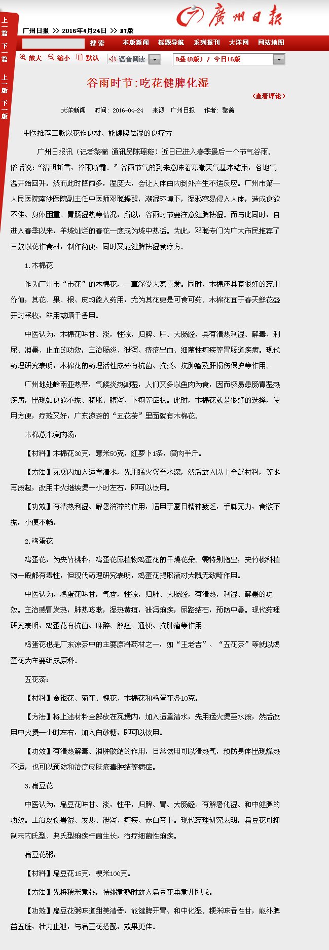 《广州日报》:谷雨时节:吃花健脾化湿 2016年4月24日B7版