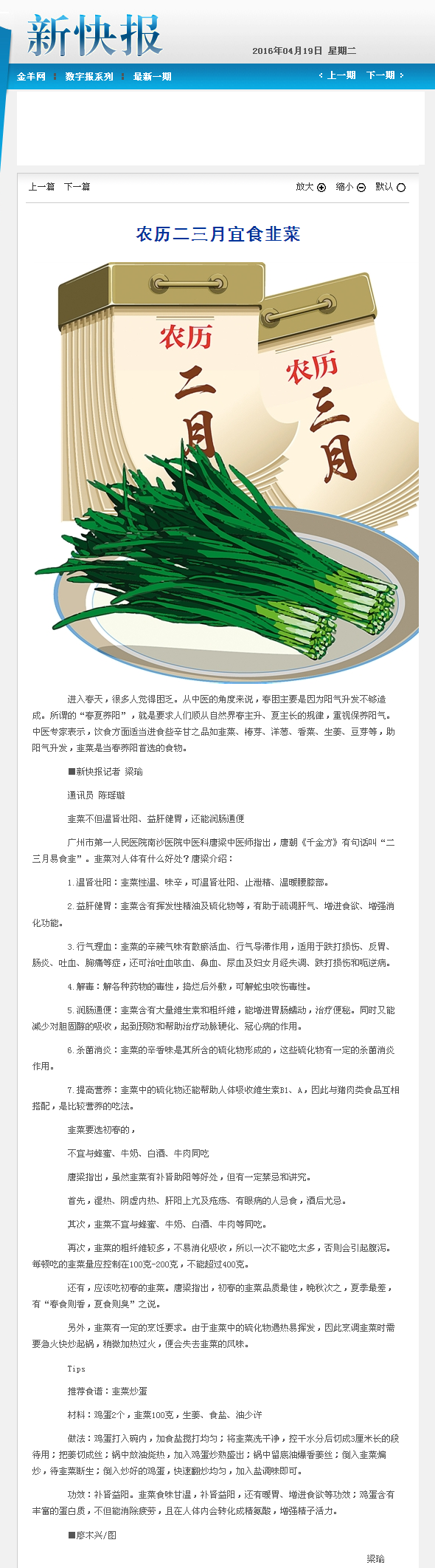 《新快报》:农历二三月宜食韭菜 2016年4月19日B07版