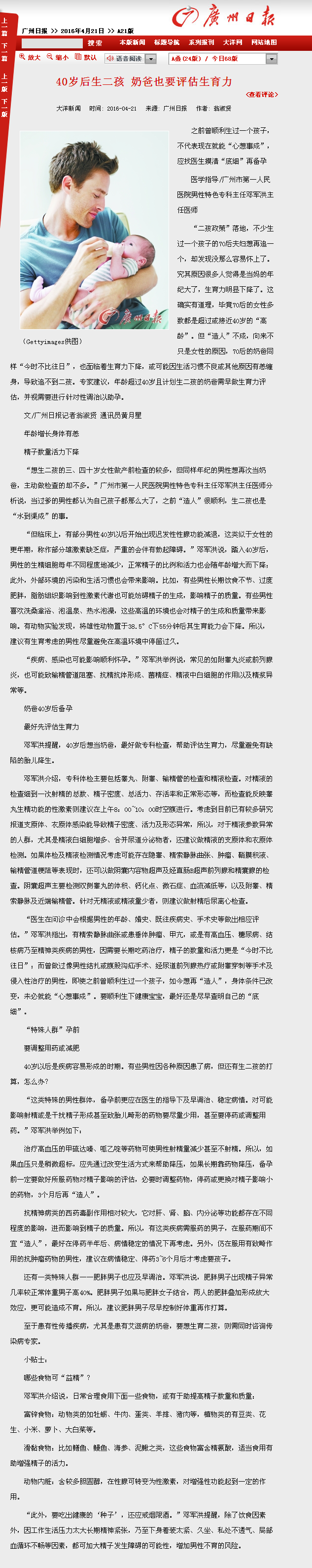 《广州日报》:40岁后生二孩 奶爸也要评估生育力 2016年4月21日 A21版