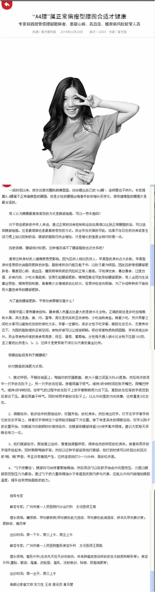 《南方都市报》:“A4腰”属正常偏瘦型腰围合适才健康 2016年4月20日GS03版