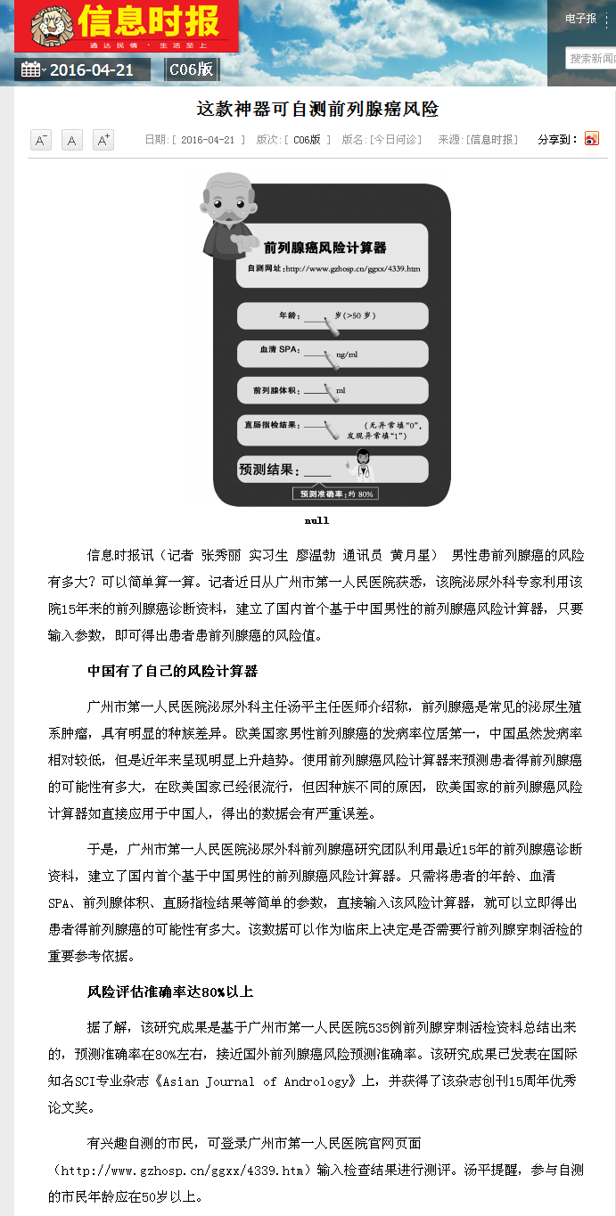 《信息时报》:这款神器可自测前列腺癌风险 2016年4月21日 C06版