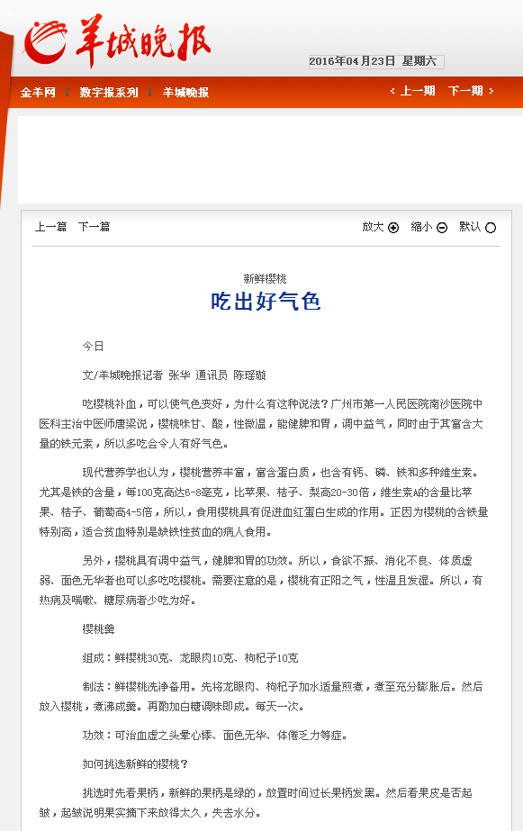 《羊城晚报》:新鲜樱桃吃出好气色 2016年4月23日B08版