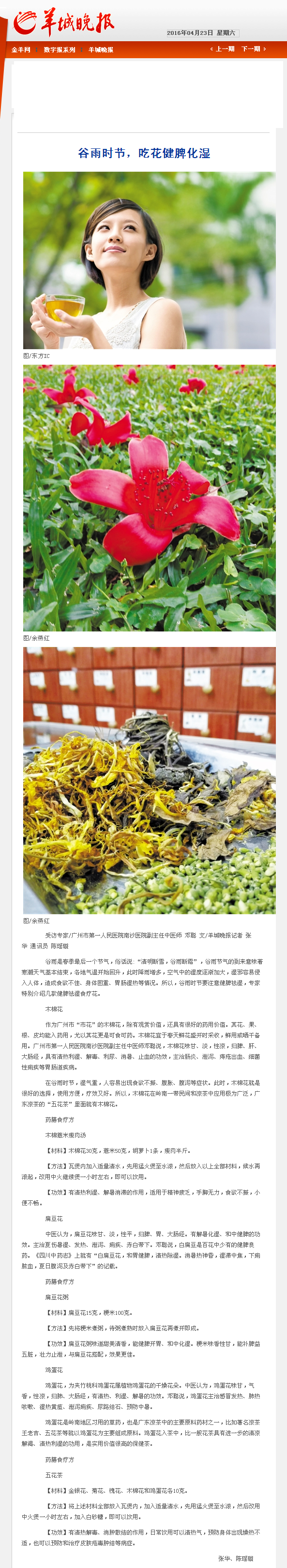 《羊城晚报》:谷雨时节吃花健脾化湿 2016年4月23日B08版