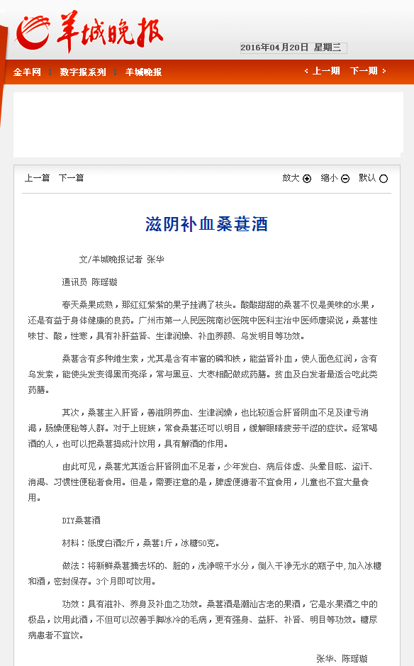 《羊城晚报》:滋阴补血桑葚酒 2016年4月20日A20版