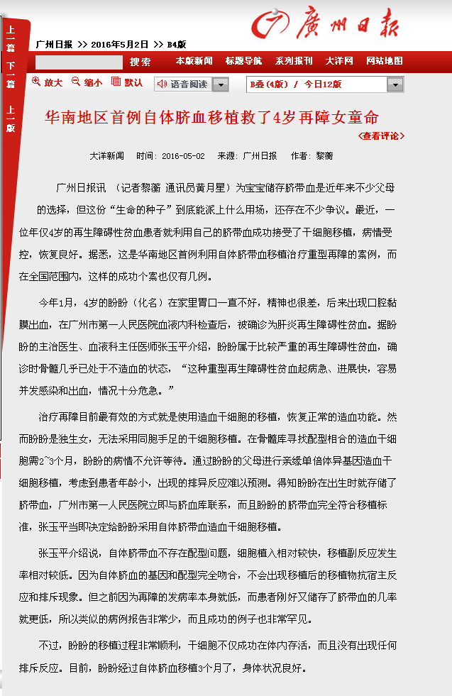 《广州日报》:华南地区首例自体脐血移植救了4岁再障女童的命 2016年5月2日B4版