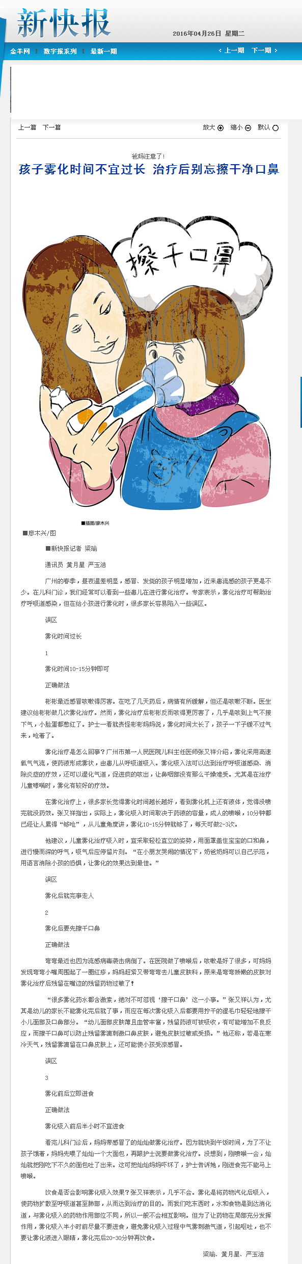 《新快报》:孩子雾化时间不宜过长 治疗后别忘擦干净口鼻 2016年4月26日B07版