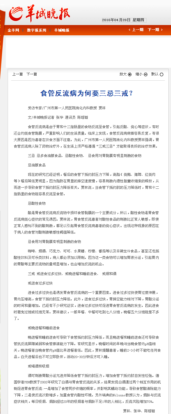 《羊城晚报》:食管反流病为何要三忌三戒 2016年4月28日A20版