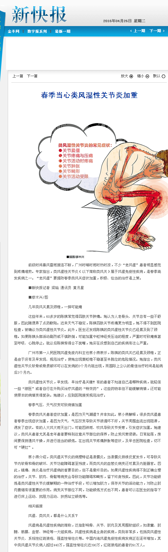 《新快报》:春季当心类风湿性关节炎加重 2016年4月26日B03版
