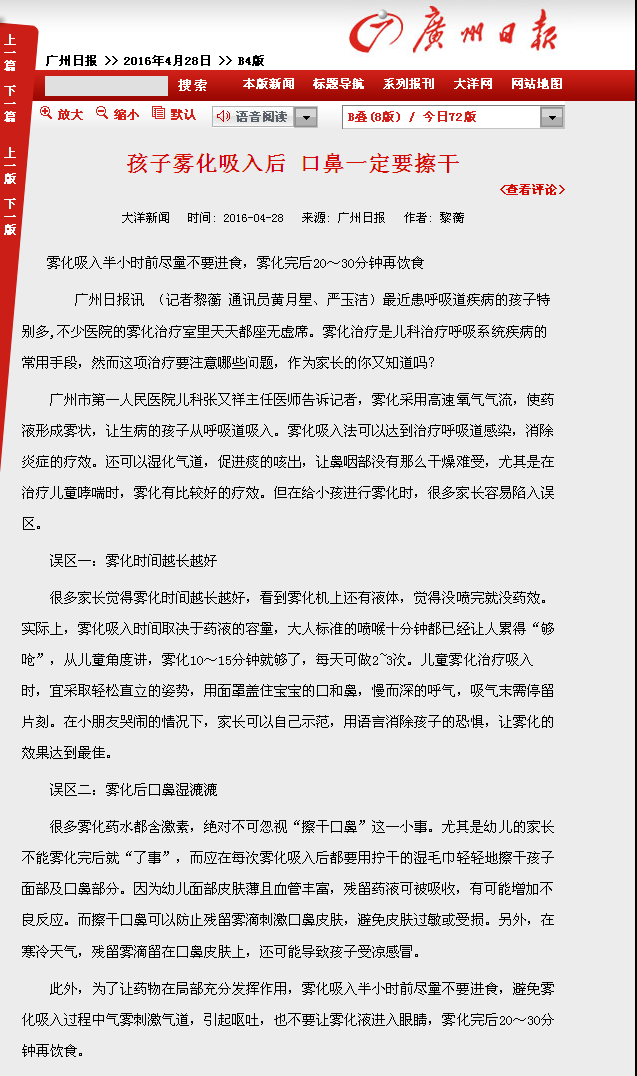 《广州日报》:孩子雾化吸入后,口鼻一定要擦干 2016年4月28日B4版