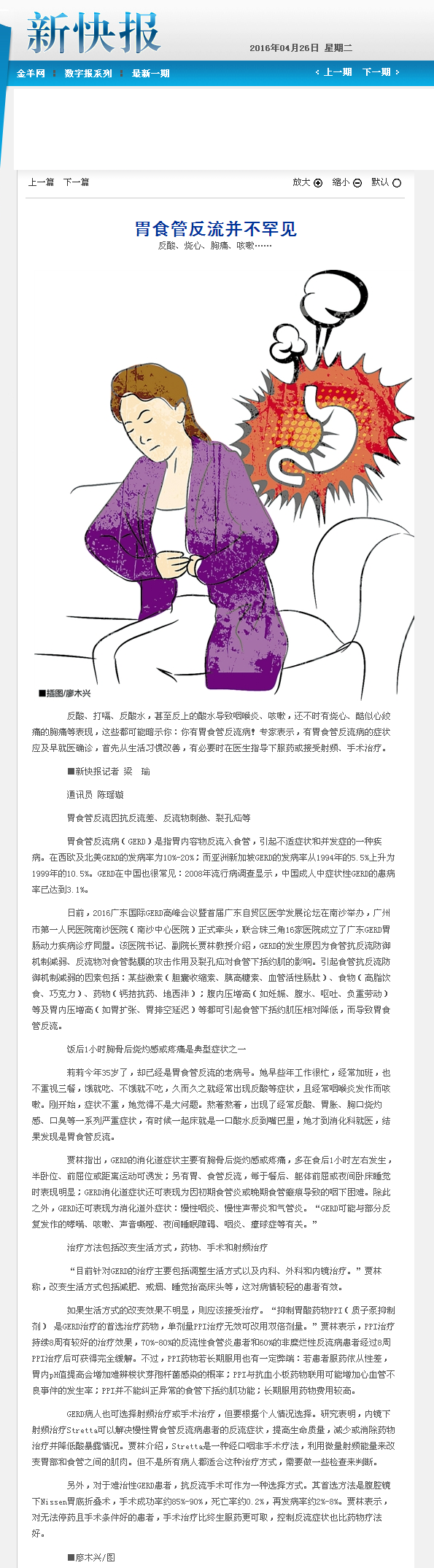 《新快报》:胃食管反流并不罕见 2016年4月26日B06版