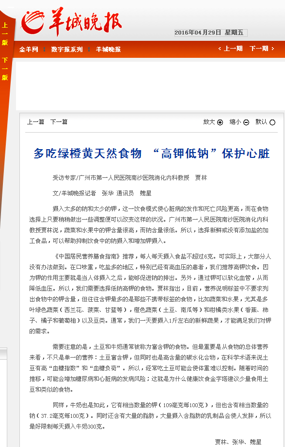 《羊城晚报》:多吃绿橙黄天然食物 “高钾低钠”保护心脏 2016年4月29日A20版