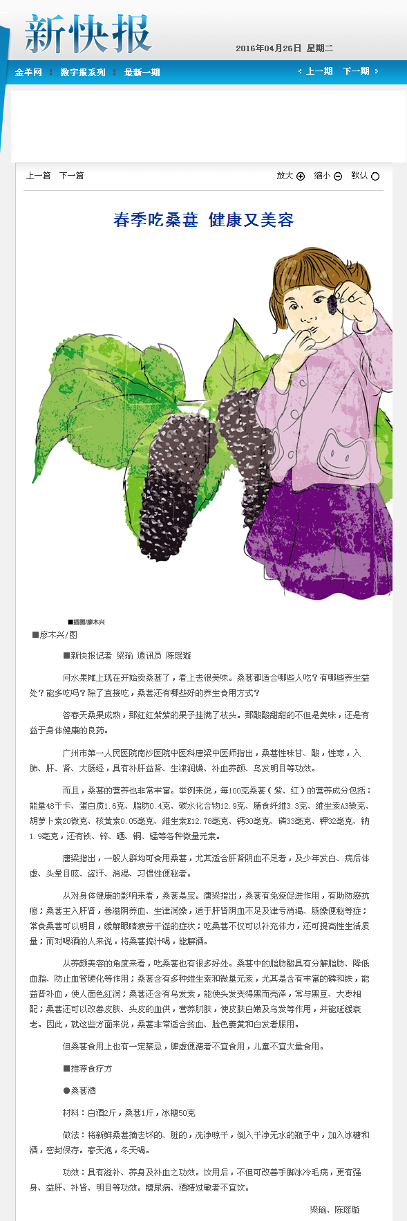 《新快报》:春季吃桑葚 健康又美容 2016年4月26日B10版