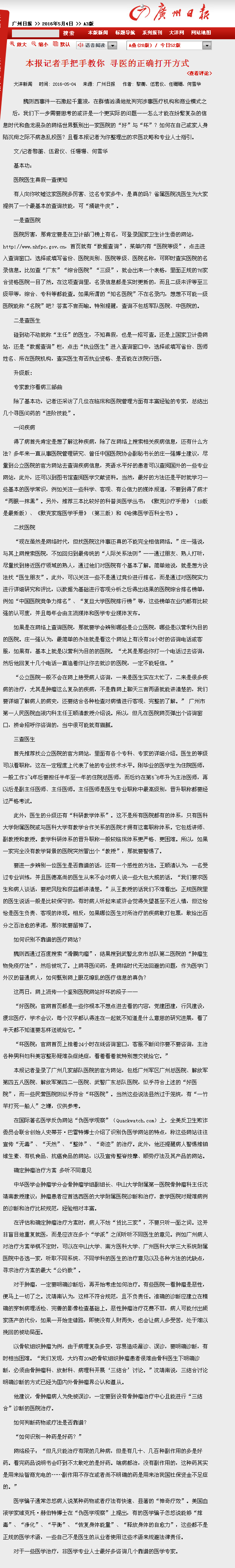《广州日报》:本报记者手把手教你 寻医的正确打开方式 2016年5月4日A3版