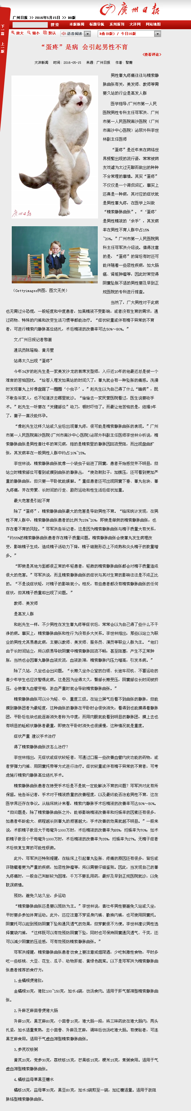 《广州日报》:蛋疼是病,会引起男性不育 2016年5月15日B8版