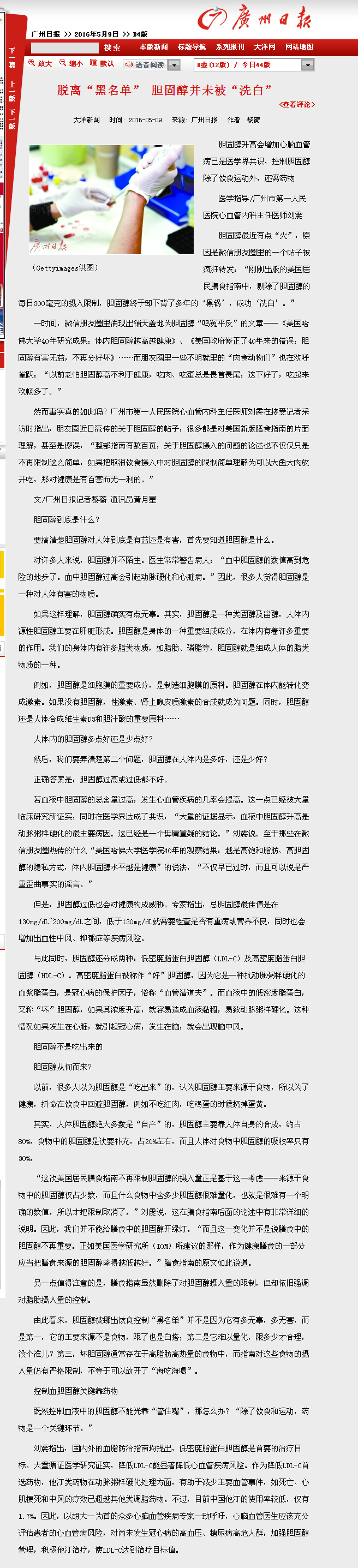 《广州日报》:脱离“黑名单” 胆固醇并未被“洗白” 2016年5月9日B4版