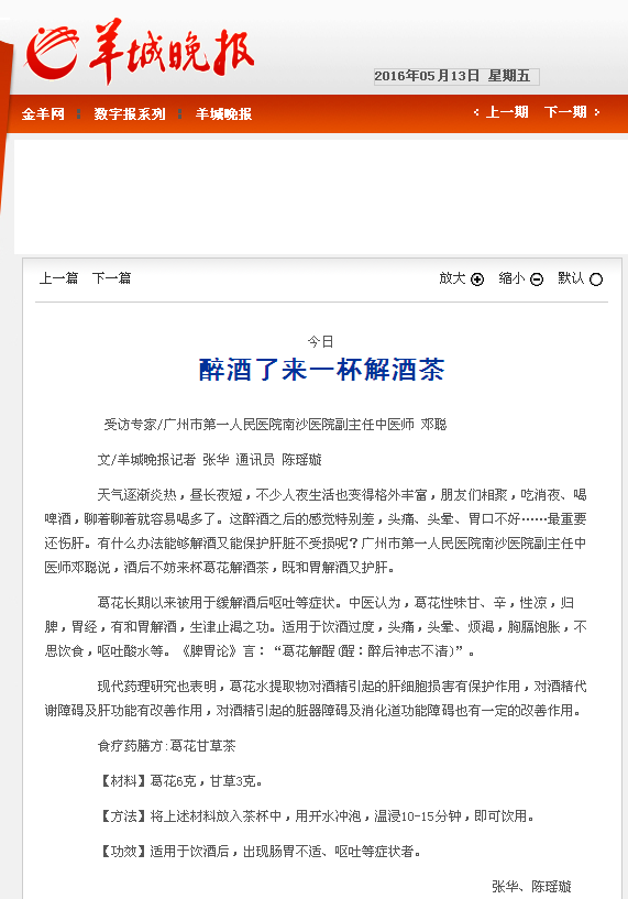 《羊城晚报》:醉酒了来一杯解酒茶 2016年5月13日A20版