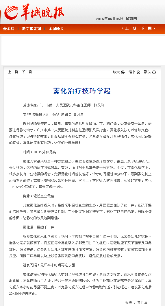 《羊城晚报》:雾化治疗技巧学起 2016年5月5日A20版
