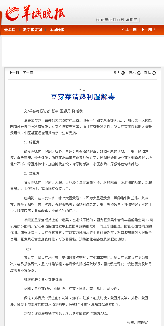 《羊城晚报》:豆芽菜清热利湿解毒 2016年5月11日A20版
