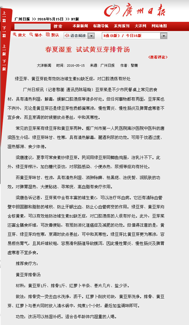 《广州日报》:春夏湿重,试试黄豆芽排骨汤 2016年5月15日B7版