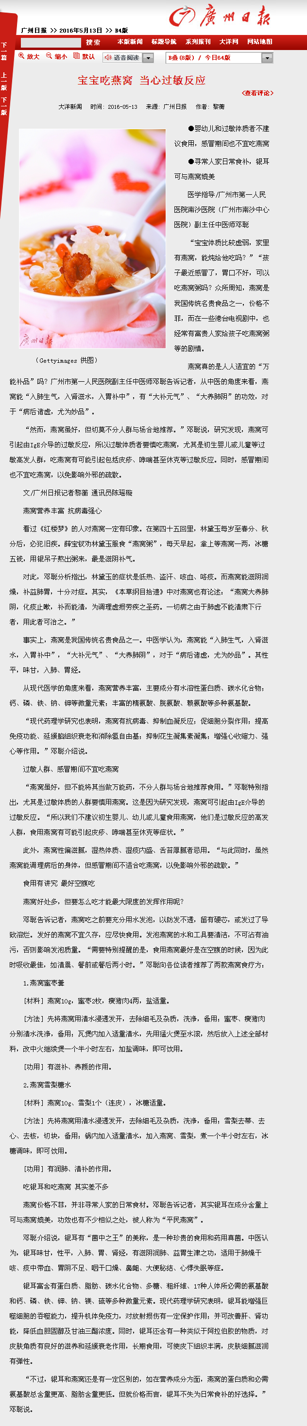 《广州日报》:宝宝吃燕窝,当心过敏反应 2016年5月13日B4版