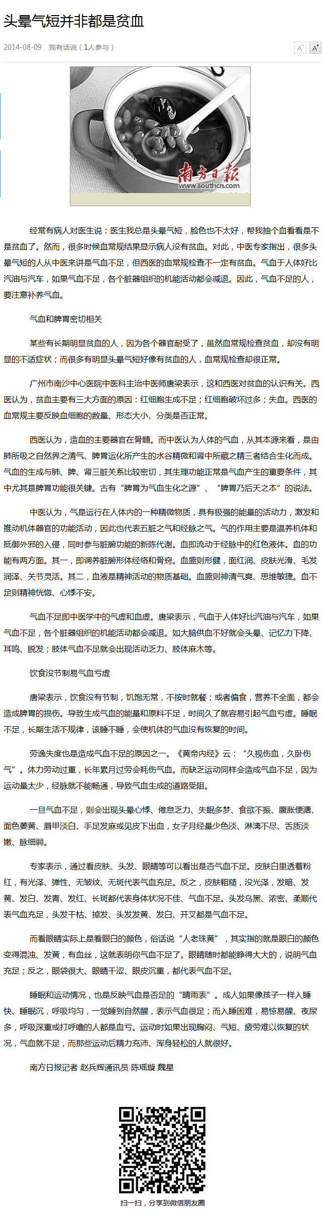 《南方日报》:头晕气短并非都是贫血 2014年8月9日A21版