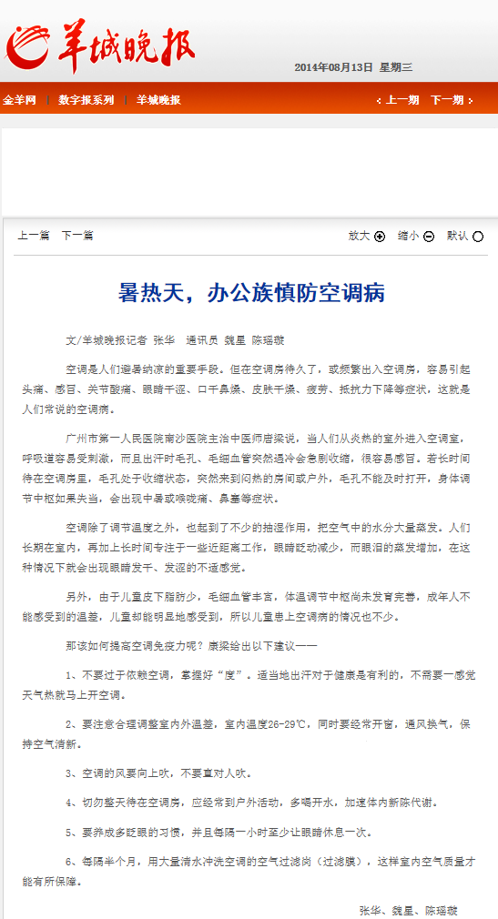 《羊城晚报》:暑热天,办公族慎防空调病 2014年8月13日B07版