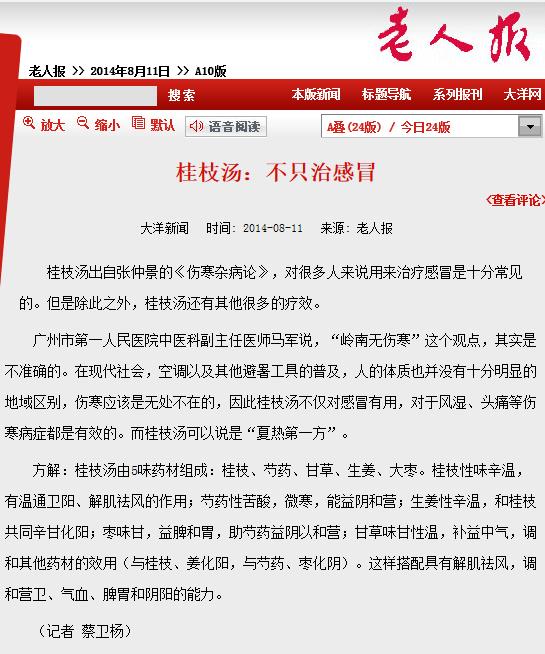 《老人报》:桂枝汤:不只治感冒 2014年8月11日A10版