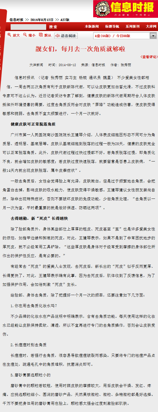 《信息时报》:靓女们,每月去一次角质就够啦 2014年8月12日A27版