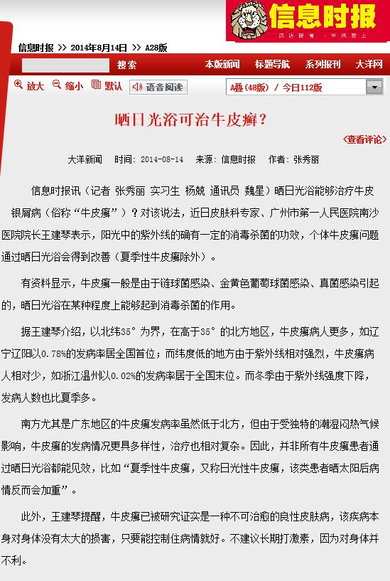 《信息时报》:晒日光浴可治牛皮癣? 2014年8月14日A28版