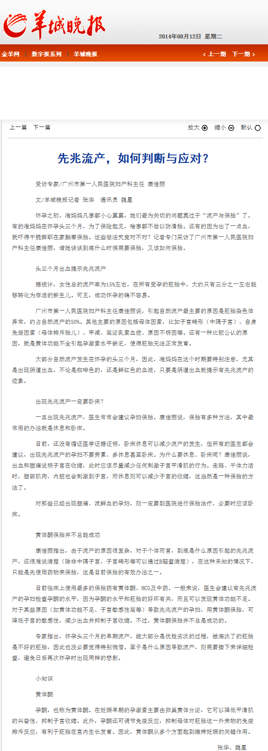 《羊城晚报》:先兆流产,如何判断与应对? 2014年8月12日B14版