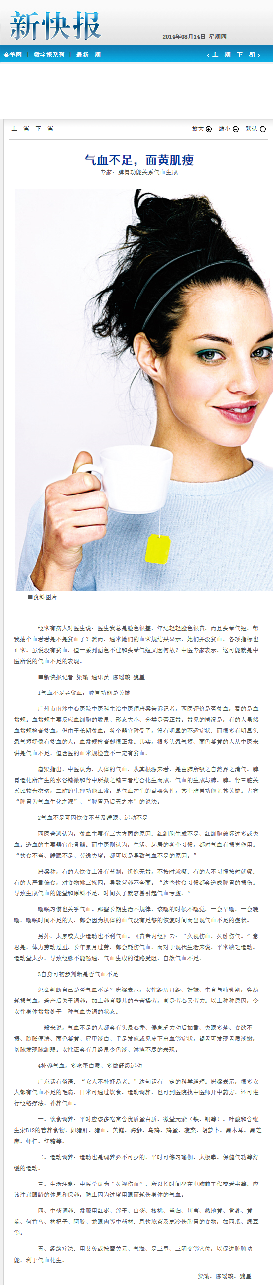 《新快报》:气血不足 面黄肌瘦 2014年8月14日D06版