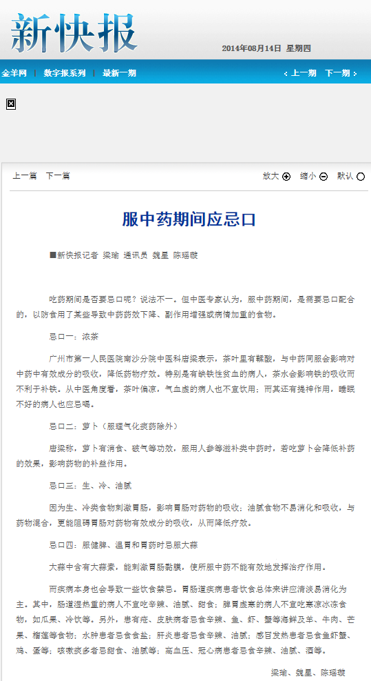 《新快报》:服中药期间应忌口 2014年8月14日D08版