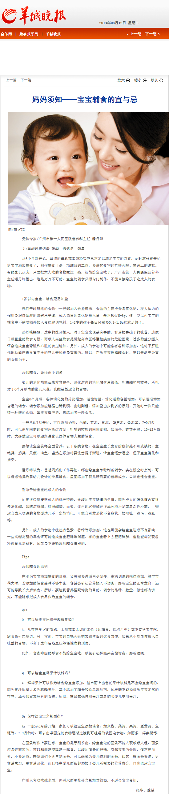 《羊城晚报》:妈妈须知——宝宝辅食的宜与忌 2014年8月12日B15版