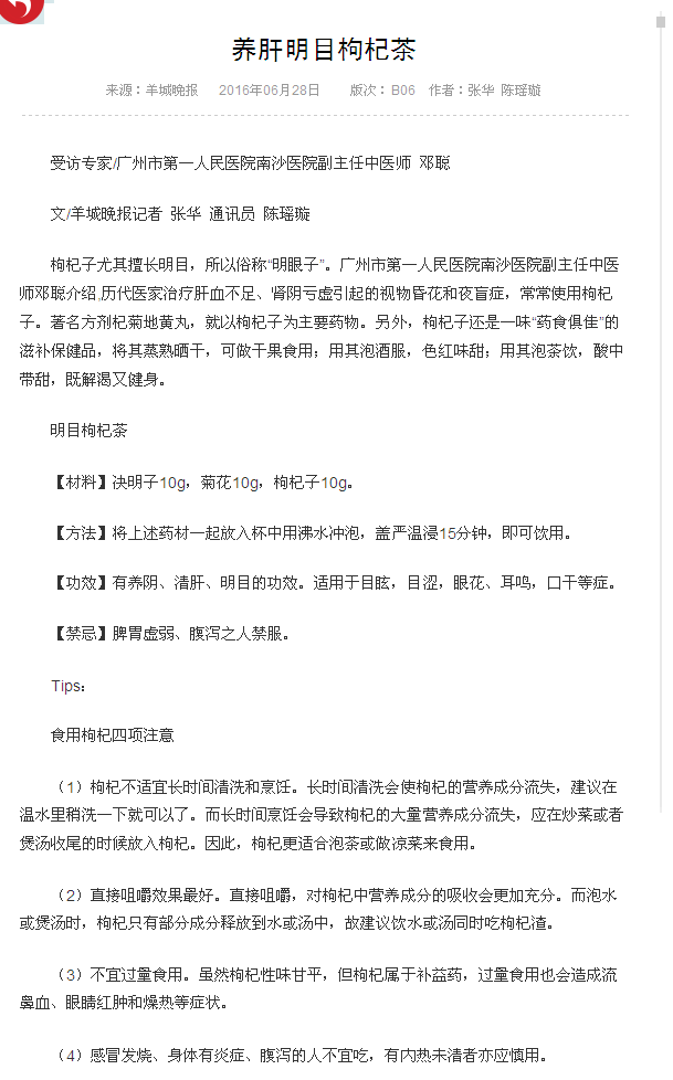 《羊城晚报》:养肝明目枸杞茶 2016年6月28日B6版