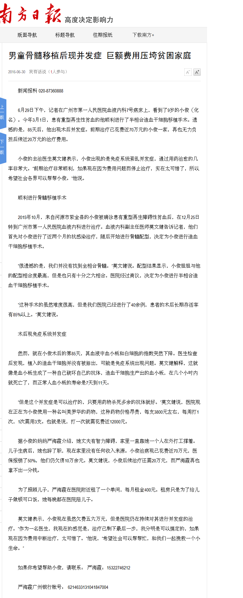 《南方日报》:男童骨髓移植后现并发症 巨额费用压垮贫困家庭 2016年6月30日GC04版