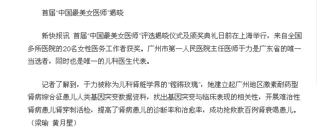 《新快报》:首届“中国最美女医师”揭晓 2016年6月28日B01版